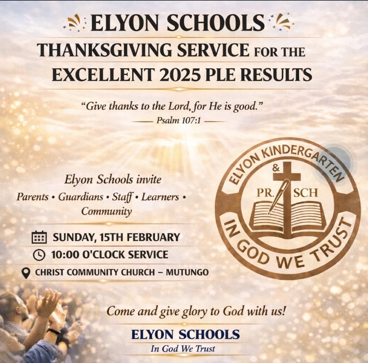 Elyon Kindergarten and Primary School (with campuses in Mutungo–Biina and Nsangi) joyfully invites parents, guardians, staff, current learners, alumni, and the entire community to a special Thanksgiving Service this coming Sunday. The event is a heartfelt expression of gratitude to God for the exceptional performance of the school’s 2025 Primary Leaving Examinations (PLE) candidates.